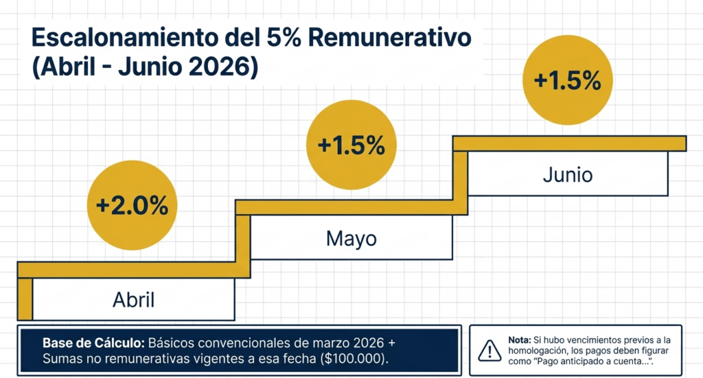 El acuerdo establece una recomposición salarial total del 5% para el trimestre abril-junio de 2026, calculado sobre las escalas básicas de marzo más las sumas no remunerativas vigentes a esa fecha. El incremento se liquidará de forma escalonada de la siguiente manera: