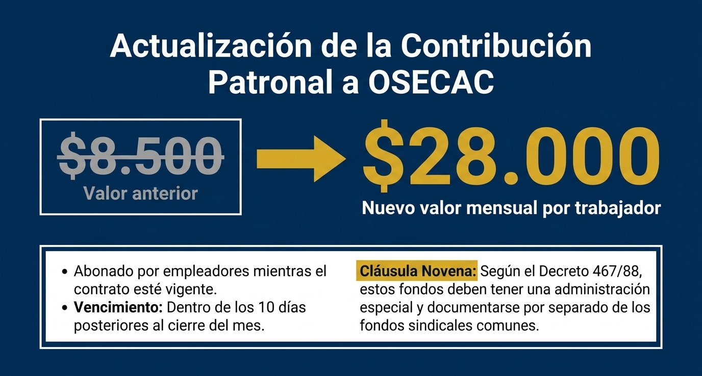 - Contribución a OSECAC: Para garantizar el funcionamiento de la obra social del sector, se incrementó la contribución adicional solidaria a cargo de los empleadores, que pasó de $8.500 a $28.000 mensuales por cada trabajador.