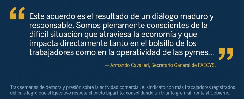 Luego de un periodo de marcada demora y negociaciones trabadas, el Gobierno nacional finalmente cedió y homologó sin modificaciones la paritaria de la Federación Argentina de Empleados de Comercio y Servicios (FAECYS). La decisión representa un triunfo político y gremial para Armando Cavalieri, titular del sindicato mercantil, quien logró sostener los términos acordados originalmente con la Cámara Argentina de Comercio (CAC), la CAME y UDECA.