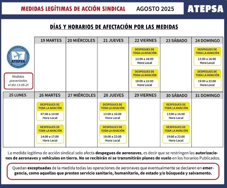 Desde ATEPSA informaron que la adhesión a las medidas de fuerza alcanzó a los 54 aeropuertos del país y «contando con un amplio apoyo de los compañeros y compañeras de los servicios de navegación aérea». Destacaron que «lo realizado en estos últimos días demuestra la importancia estratégica de los servicios que brindamos, permitiendo la conectividad segura y eficaz del país, lo cual pone de manifiesto la justificación del reclamo», indicaron, fue a partir de estas medidas que se pudo alcanzar la reunión con la Secretaría de Trabajo. ATEPSA también advirtió que, si no se presentan avances en la negociación, las protestas y paros podrían extenderse durante septiembre. Esto mantiene en vilo al sector aeronáutico, que ya enfrentó importantes interrupciones en los paros escalonados de estás semanas. Los controladores aéreos reafirmaron su compromiso con la lucha colectiva, subrayando que “un ATEPSA fuerte y federal lo construimos entre todos y todas”.