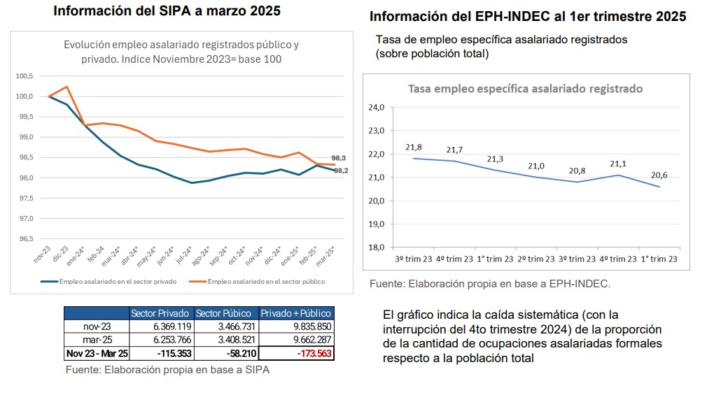 Según la EPH (Encuesta Permanente de Hogares) La tasa de empleo total que era del 45,5% antes de Milei (3er trimestre 2023) pasa a ser del 44,4% a comienzos del 2025, es decir, cae 1,1%. Por su parte, la tasa específica correspondiente a la población ocupada asalariada registrada pasó del 21,8% en el 3er trimestre 2023 al 20,6% durante el primer trimestre 2025 (una caída de 1,2%).