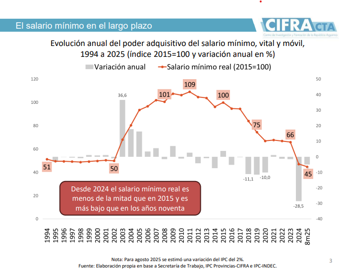 Un informe elaborado por el Centro de Investigación y Formación de la República Argentina (CIFRA), de la CTA de los Trabajadores, reveló un dato alarmante: el Salario Mínimo Vital y Móvil (SMVM) sufrió una caída del poder adquisitivo del 32,5%, desde la asunción al gobierno de Javier Milei en diciembre de 2023. Se encuentra por debajo de los niveles de la convertibilidad y la década de 1990, y un 56,7% por debajo de su capacidad de compra en noviembre de 2015.