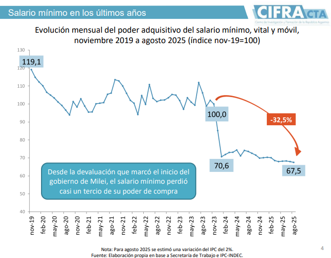 Producto de la devaluación de diciembre de 2023, se generó un recorte brutal en el poder adquisitivo. El salario mínimo se ubicó en agosto de 2025 en un nivel real que resulta 43,4% más bajo que en noviembre de 2019, al final del gobierno de Cambiemos y 56,7% menor que noviembre de 2015.