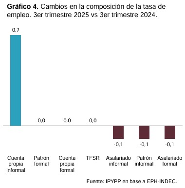 El refugio en el «rebusque» es una de las claves para entender la “baja” en el desempleo mientras la sensación de crisis persiste, ya que radica en la calidad de la ocupación generada. Según el informe, el crecimiento del empleo en el último año se explica exclusivamente por un cambio regresivo en la estructura ocupacional, donde las «changas» y el autoempleo de subsistencia han desplazado al trabajo con derechos. El cuentapropismo ha escalado hasta representar el 24,5% del total de ocupados, su nivel más alto exceptuando el periodo de pandemia.