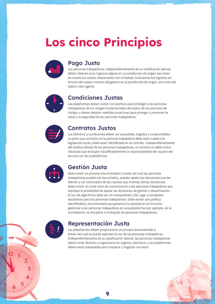 Según el informe Fairwork Cloudwork Ratings 2023 existen cinco principios para medir el cumplimiento de derechos: una remuneración que contemple un salario mínimo, condiciones de trabajo que tengan en cuenta los riesgos de salud y seguridad, la transparencia en los contratos, que no existan cláusulas abusivas y la posibilidad de representación y organización colectiva. Según este informe, las puntuaciones evaluadas ese año a 15 empresas mostraron que las plataformas aún están lejos de salvaguardar las normas básicas del trabajo justo.