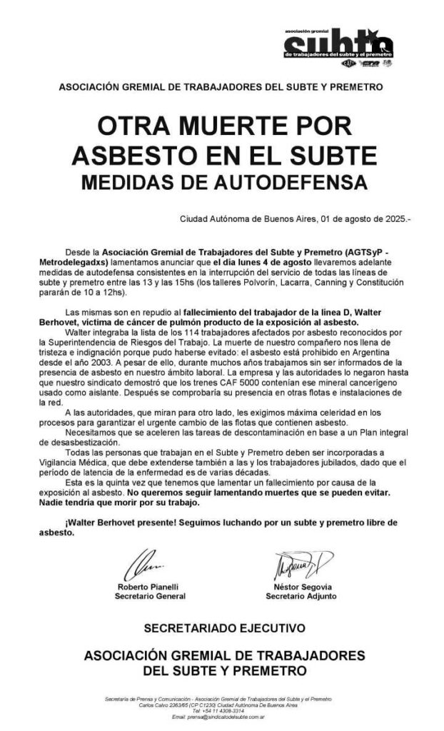 El jueves pasado falleció otro trabajador del subte, que ya suman cinco trabajadores fallecidos por el material cancerígeno al que están expuestos. Los Metrodelegados de la Asociación Gremial de Trabajadores del Subte y Premetro (AGTSyP) de la Ciudad de Buenos Aires volvieron a reclamar medidas urgentes, y en el día de hoy realizarán un paro de dos horas en todas las líneas del Subte y el Premetro. La medida, se llevará a cabo entre las 13 y las 15 horas. Las formaciones de subte contaminadas siguen circulando, mientas el cambio de las formaciones contaminadas con asbesto no tiene ni siquiera una fecha precisa.