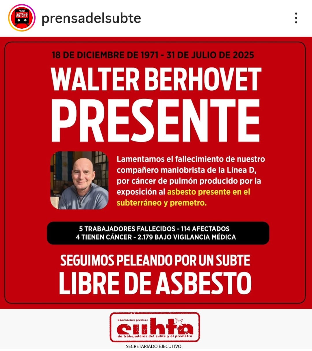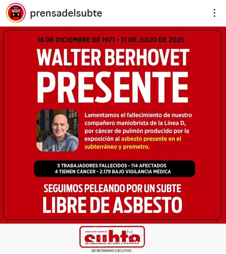 Walter Berhovet, maniobrista de la Línea D falleció este jueves por un cáncer de pulmón relacionado con la exposición al material altamente nocivo presente en el subterráneo y el Premetro. Según los datos actualizados por el sindicato, con Berhovet ya son cinco trabajadores han fallecido por enfermedades asociadas al material cancerígeno y hay 114 que presentan patologías relacionadas, de los cuales cuatro tienen cáncer diagnosticado En tanto, 2.179 empleados se encuentran bajo vigilancia médica.