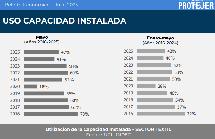La industria textil se encuentra en una situación de incertidumbre producto de la apertura importadora y la recesión del mercado interno producto del plan macro-económico del gobierno nacional. Según el Boletín Económico Sectorial en el mes de mayo de 2025, “la industria textil registró un nivel de utilización de la capacidad instalada del 47%, 6 puntos porcentuales por encima de mayo-24. Sin embargo, se mantiene -10,6 puntos porcentuales por debajo del nivel observado en mayo de 2023. Al analizar el acumulado de enero-mayo 2025, se confirma la continuidad de la tendencia negativa registrada en 2024: 6 de cada 10 máquinas permanecen detenidas en las fábricas textiles. Este indicador representa uno de los niveles más bajos de actividad del sector en términos históricos, con excepción del trimestre enero-abril de 2020 por efecto pandemia”.