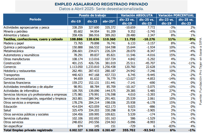 La Fundación ProTejer, organización sin fines de lucro cuya misión es asistir, desarrollar, contener e integrar a la cadena de valor agro-industrial textil y de confecciones de la República Argentina, elaboró una encuesta sectorial donde afirma que “en términos de empleo, el 72% de las empresas indicó haber tomado medidas que afectaron su dotación desde fines de 2023 hasta marzo de 2025”. Es decir, peligra el empleo, 6 de cada 10 empresas redujeron su plantilla de trabajadores en ese período, lo que marca una clara contracción del empleo industrial a nivel federal.